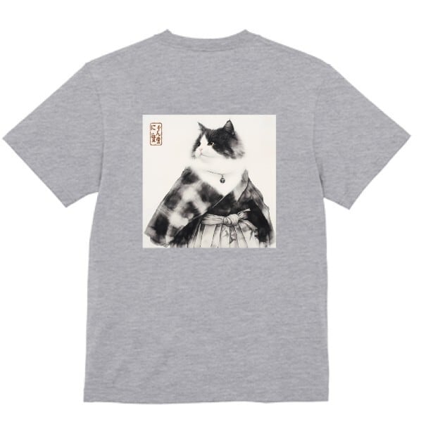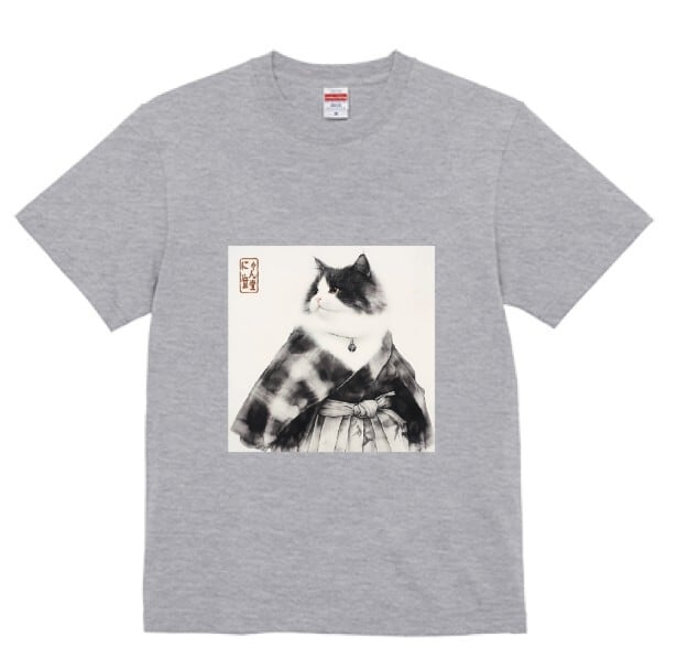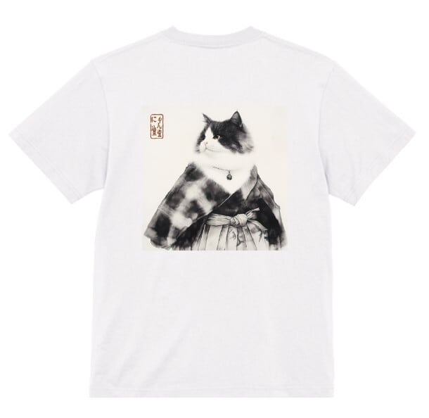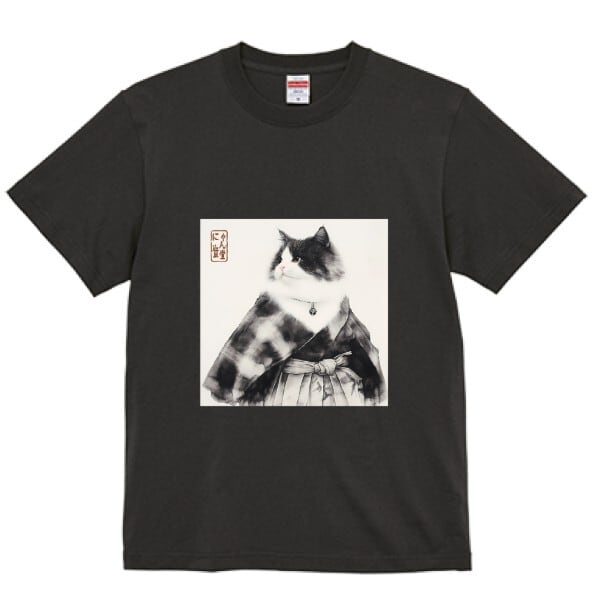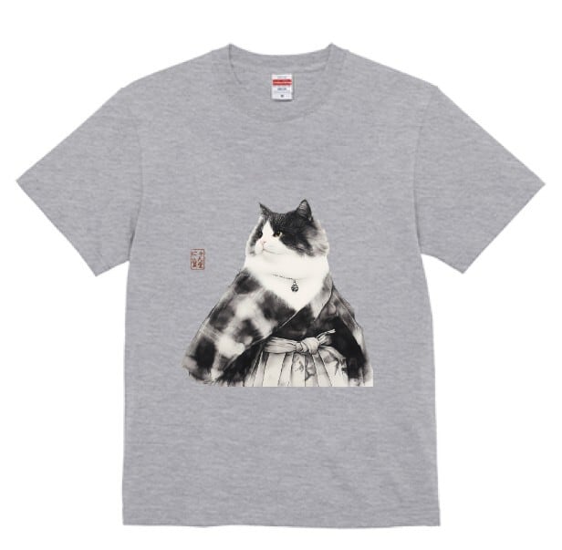 A dignified cat dressed in a traditional haori and hakama stands in quiet grace.