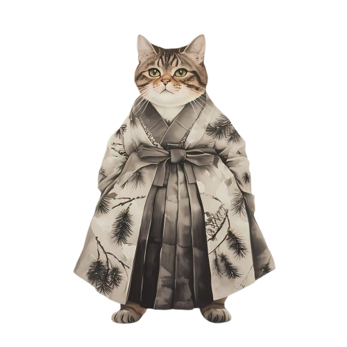 An Edo-style cat clad in calm elegance, as if listening to the whisper of pine leaves.