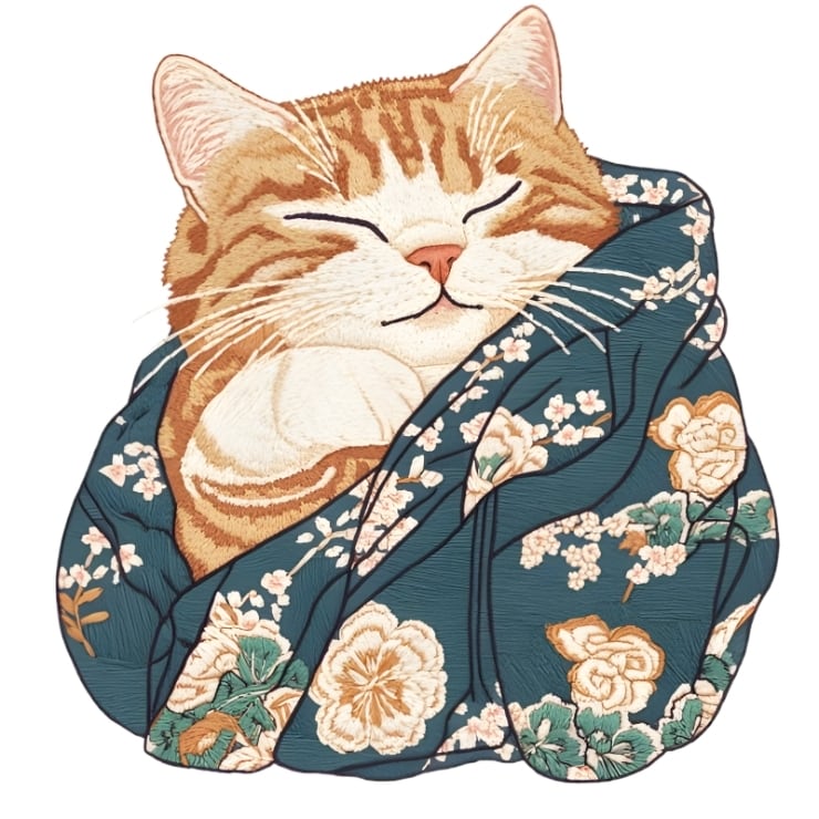 美しい和柄にくるまり、幸せそうに夢を見る猫の姿をデザインしました。