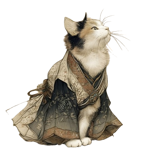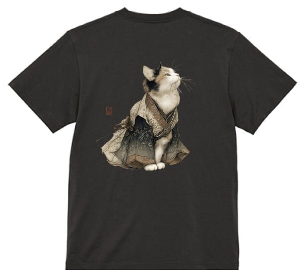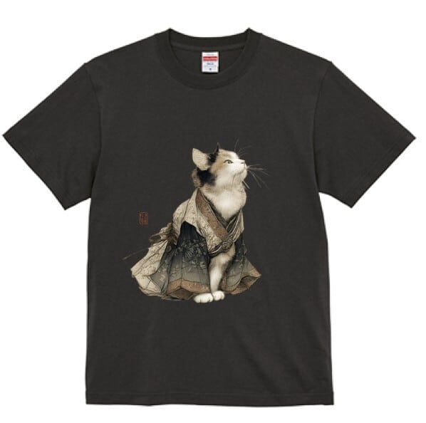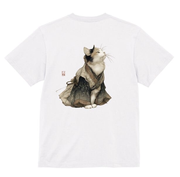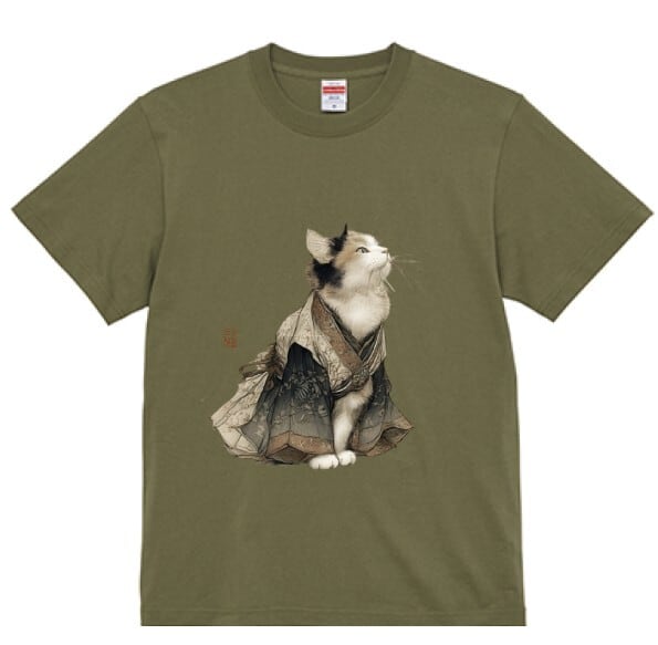 A calico cat is painted with delicate brushstrokes on soft Japanese washi paper.Clad gracefully in an elegant kimono, the cat looks up into the distance, like a beautiful woman painting.This art T-shirt is filled with an elegant and ephemeral charm, evoking the quiet passage of time.