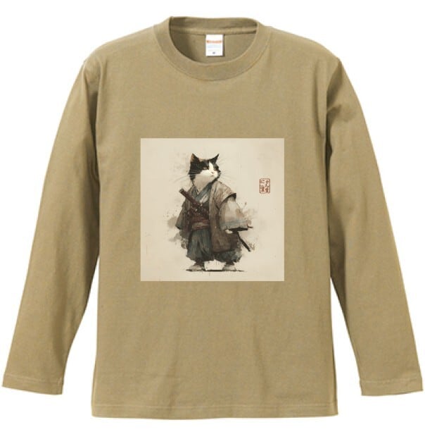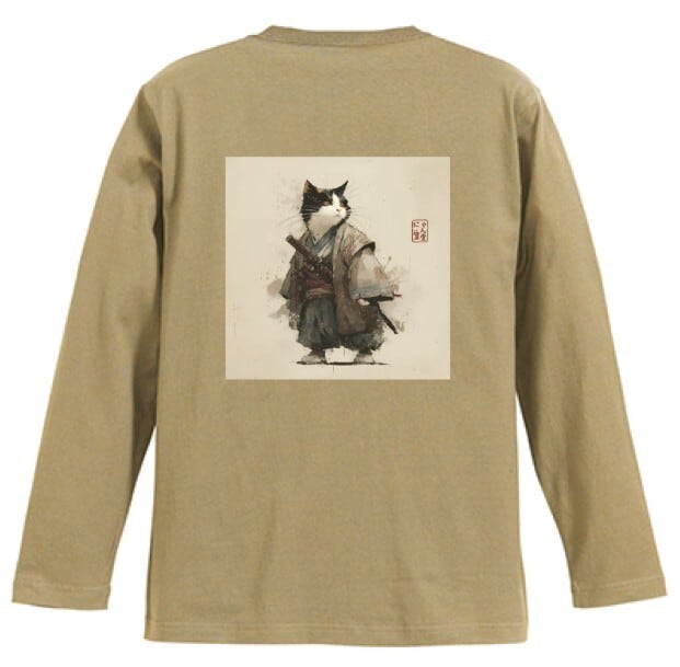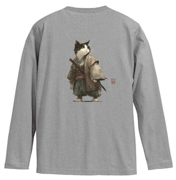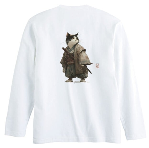 斜陽に立つ猫武士 – 墨絵風 ロングTシャツ リブなし/ Cat Samurai Standing in the Setting Sun – Japanese Art Apparel