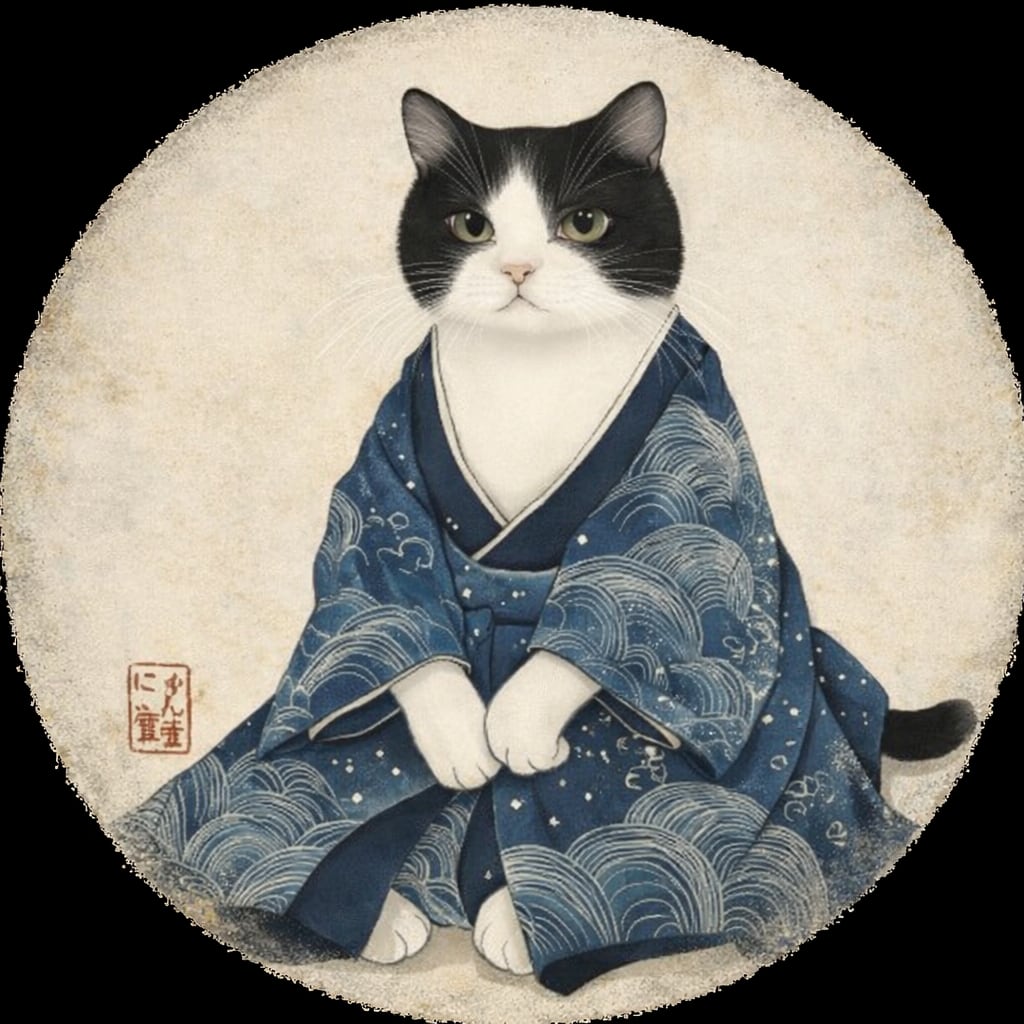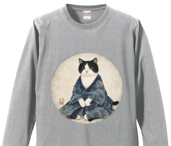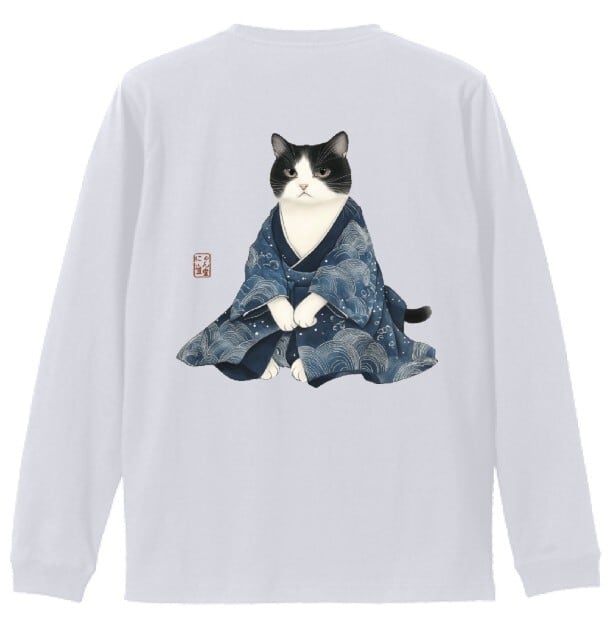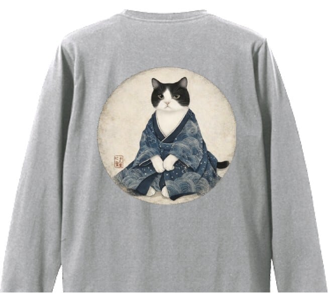 美しい古布風の着物を着た猫のアートを大きくプリント。