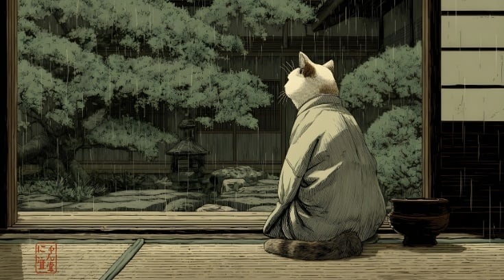 雨音に耳を澄ませる江戸猫。