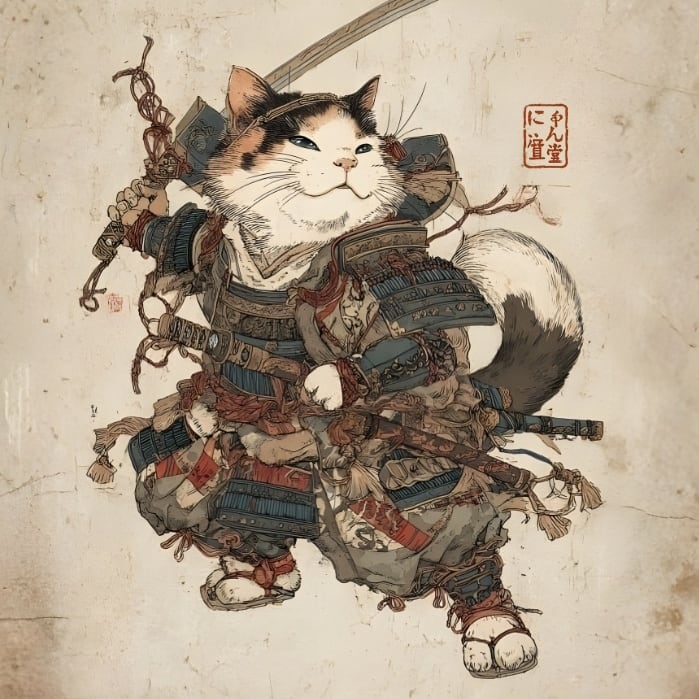A proud cat runs through the Warring States period, transcending the ages.Drawn with brushstrokes reminiscent of ukiyo-e,this cat is more than just a character.It is a one-of-a-kind being, imbued with history, elegance, and humor.