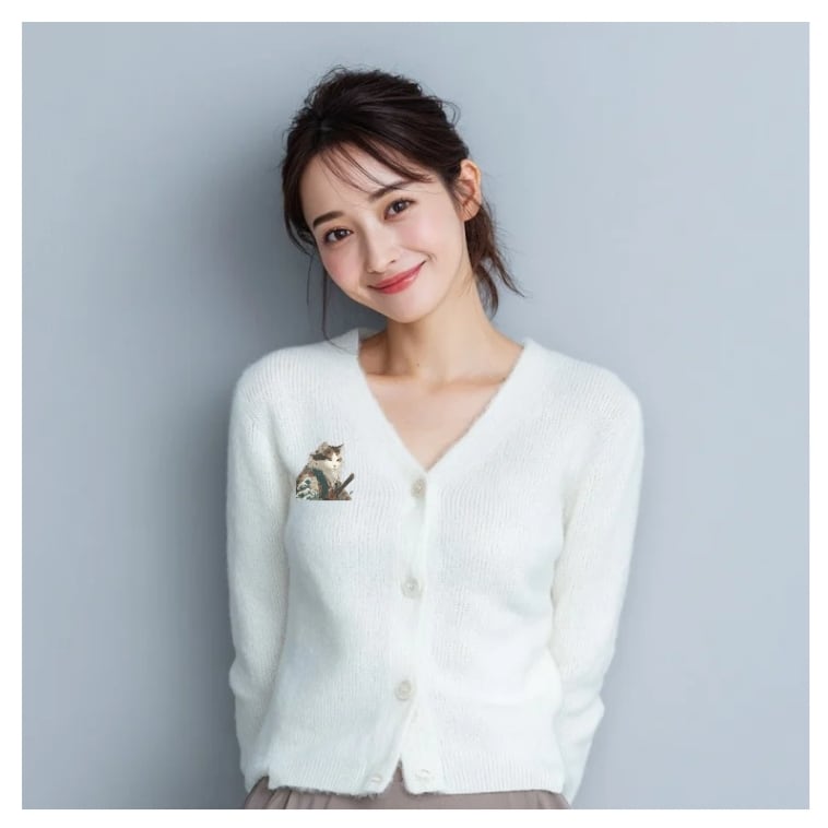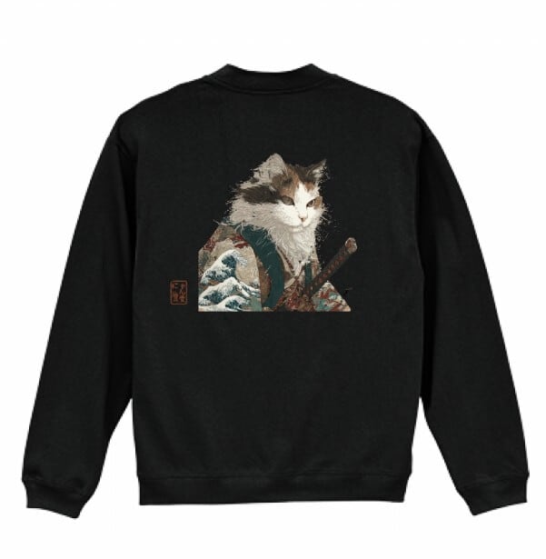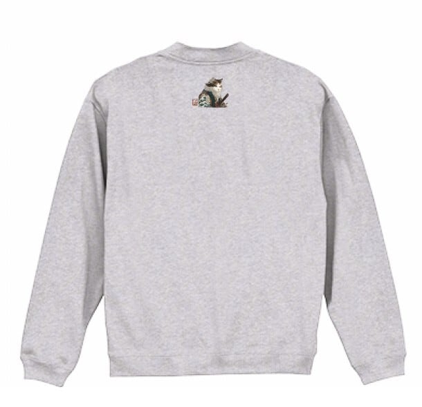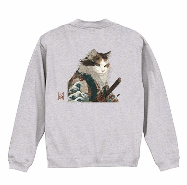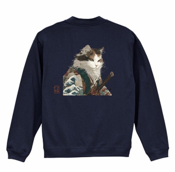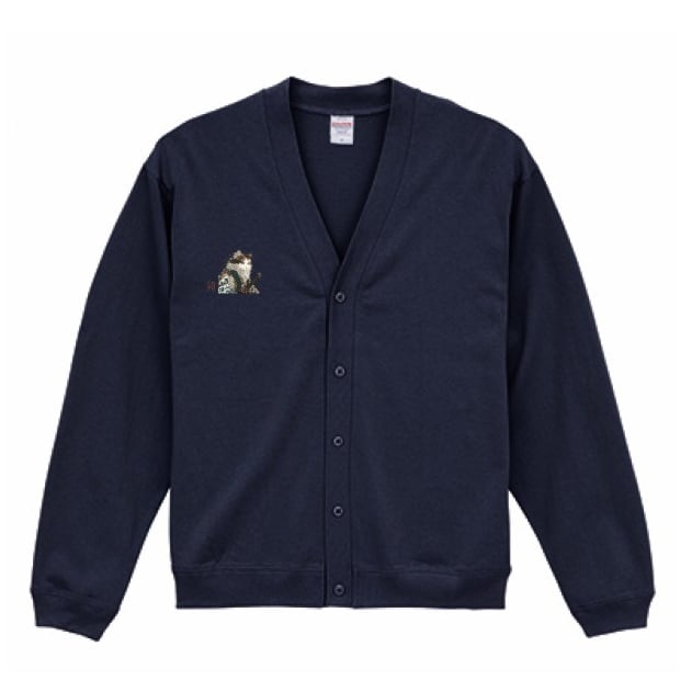 A samurai cat stands quietly in a wavy outfit.✨A chic piece of art embroidered on a thick cardigan perfect for chilly weather.