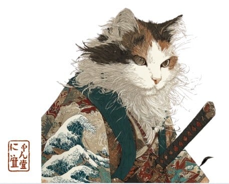 波打つ装束に身を包み、静かに佇むサムライ猫