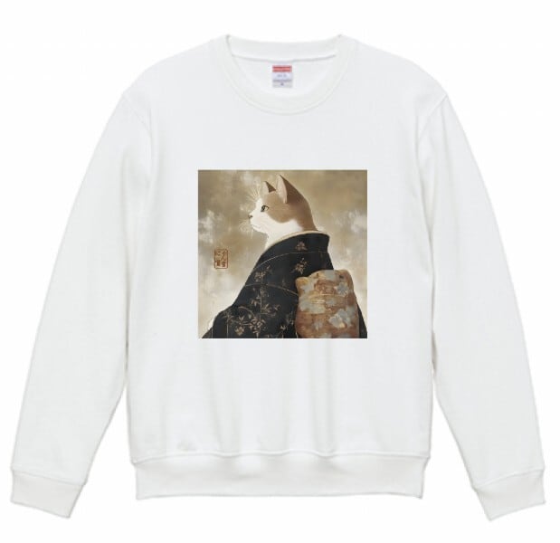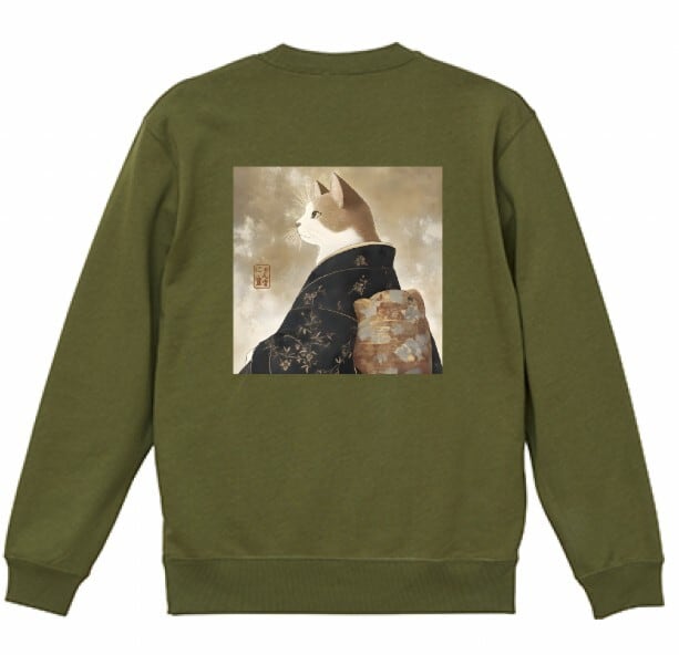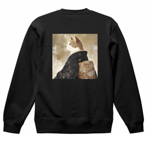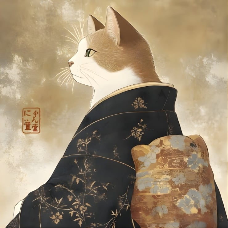 優雅な黒地の着物に、繊細な金の花模様。背に結ばれた帯は、古都の空気を思わせるような重厚な意匠。そんな和の装いに身を包んだ猫が、静かに遠くを見つめる姿が印象的な一枚。