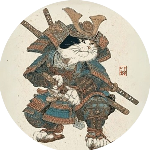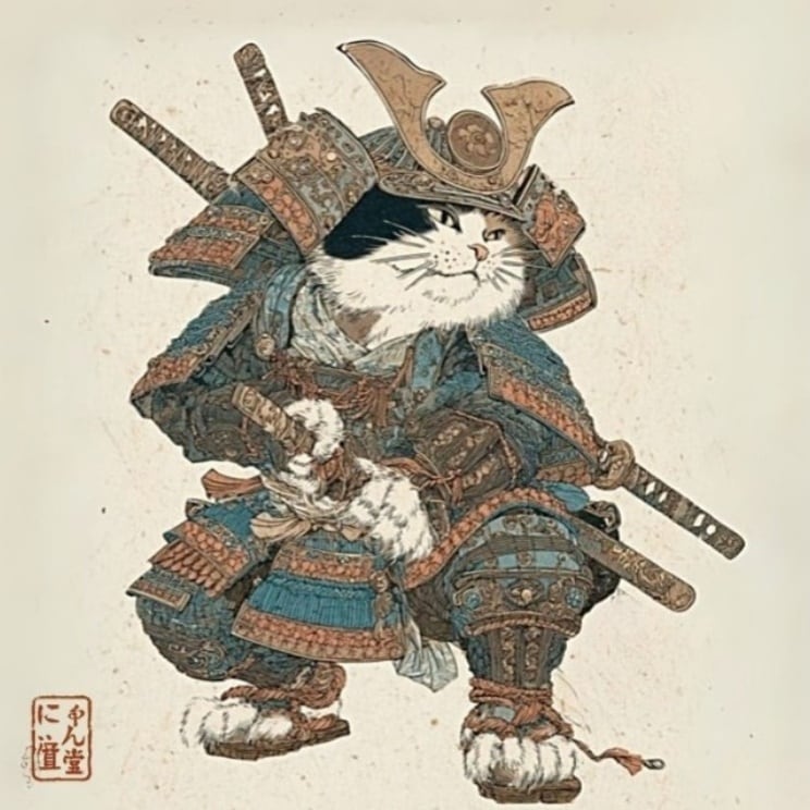 The armor is rendered in minute detail, and even the texture of the metal fittings and the overlapping layers of fabric can be felt with such precision.The distinct black and white fur and dignified expression convey both determination and elegance.