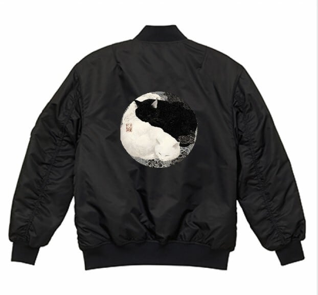 「陰陽の眠り ― 黒白猫図」MA1ジャケット(中綿入)/前、後、両面プリント