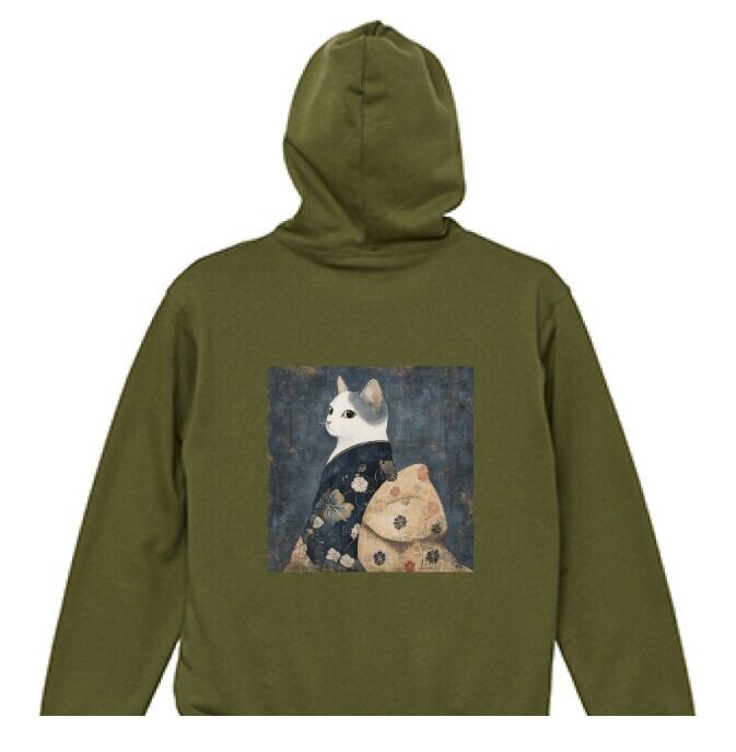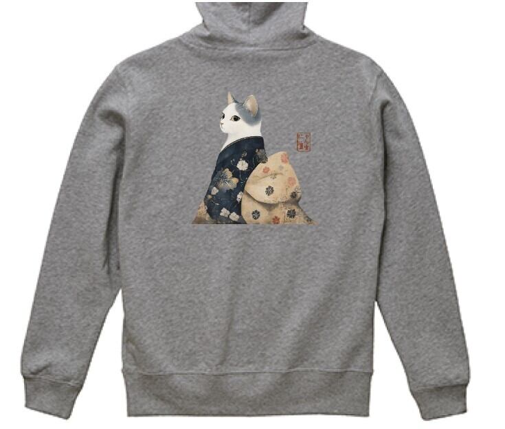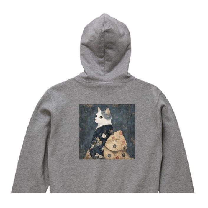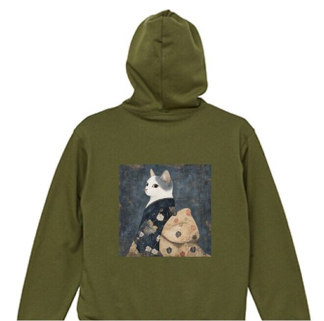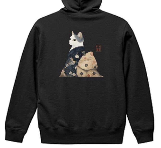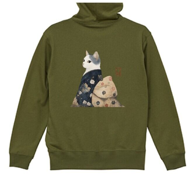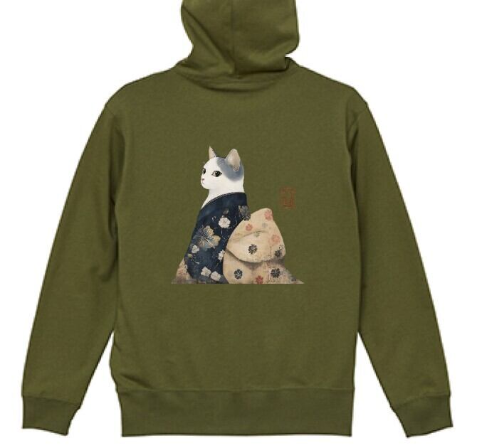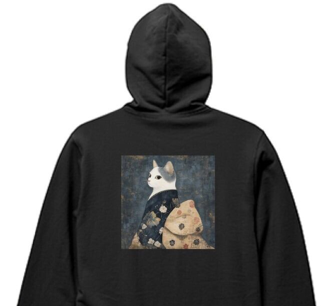 品格あふれる振袖姿の猫が、パーカーに映える和のアクセント。