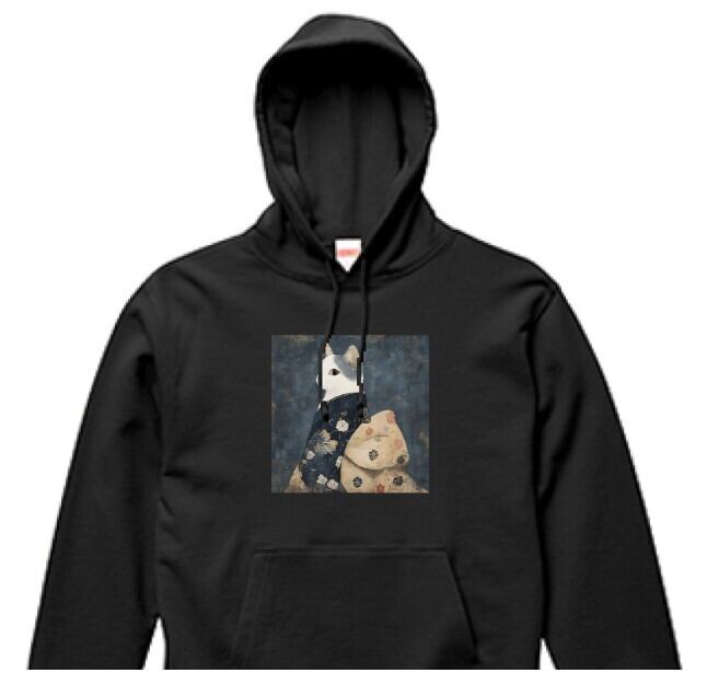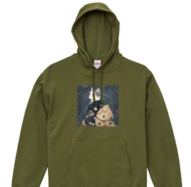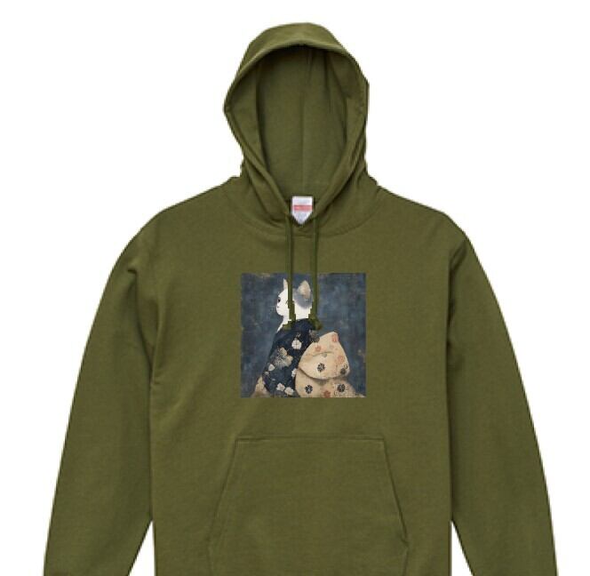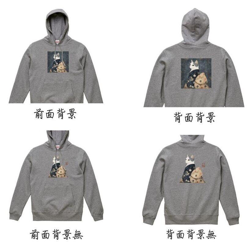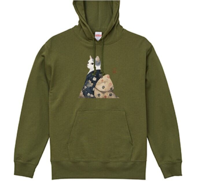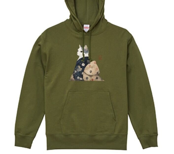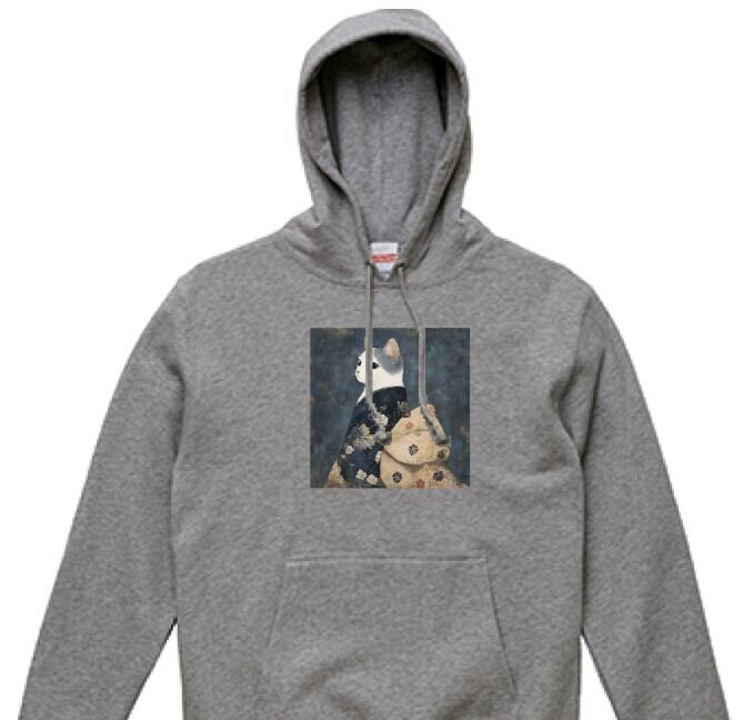 品格あふれる振袖姿の猫が、パーカーに映える和のアクセント。