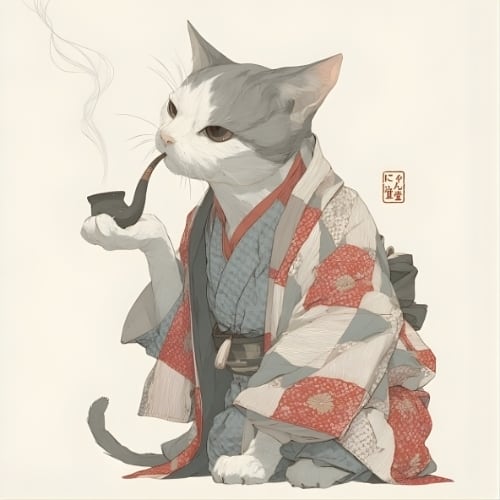 A dignified profile holding a tobacco pipe, a refined kimono, and a quiet, lingering impression.A masterpiece from Nyanko Rekido's timeless "Emotionless, Chic Cat" series.A piece with muted tones that stands out as Japanese-style art.
