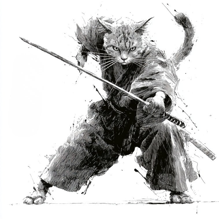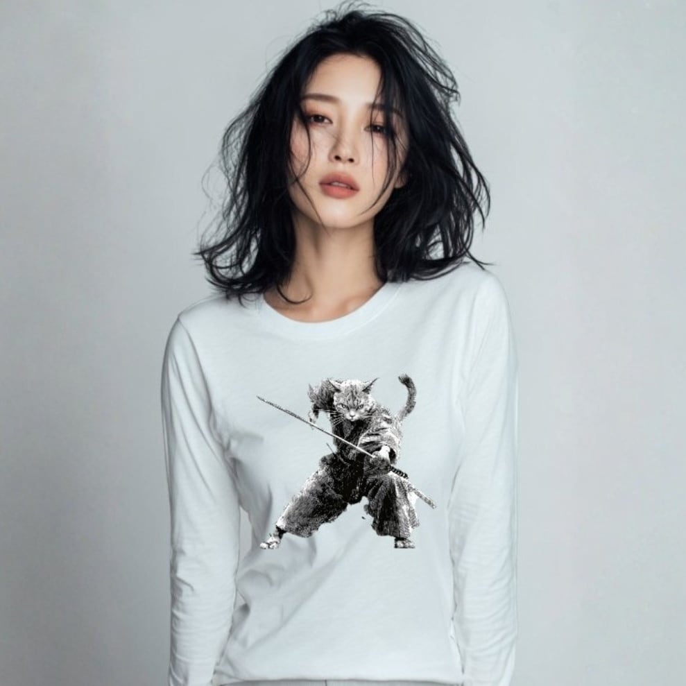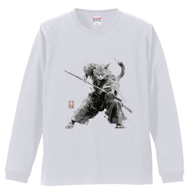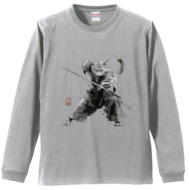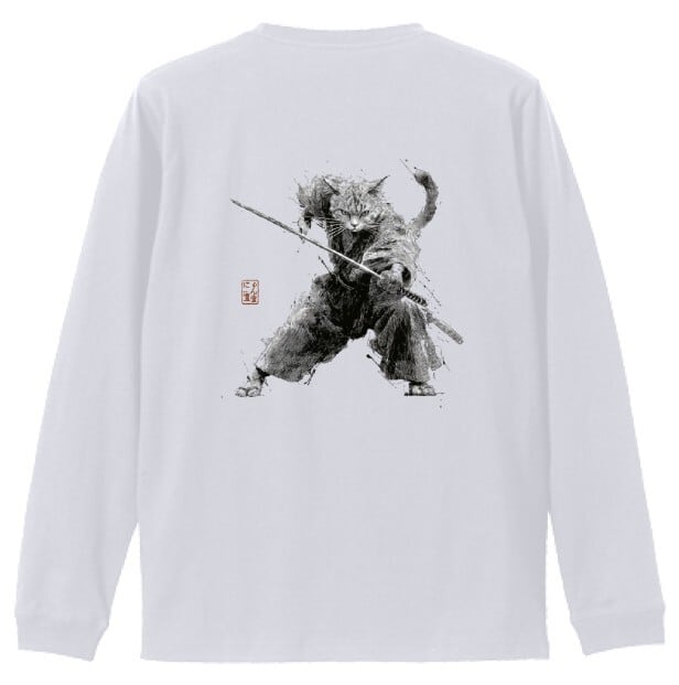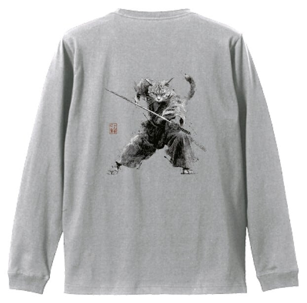 「斬り結ぶ猫 ― 江戸墨線アート」長袖Tシャツ リブ付 /""Cat Fighting - Edo Ink Line Japanese Art Apparel Rib