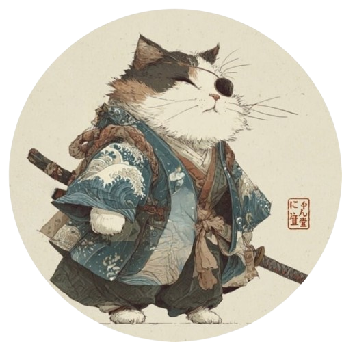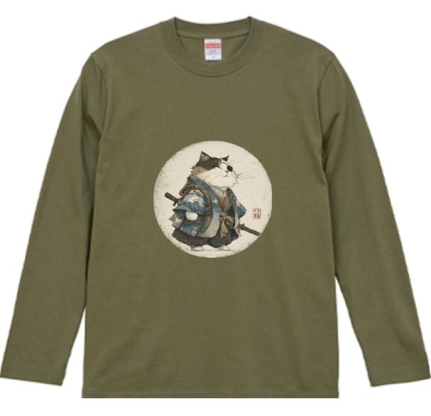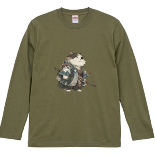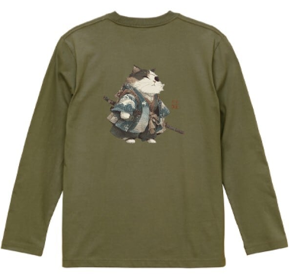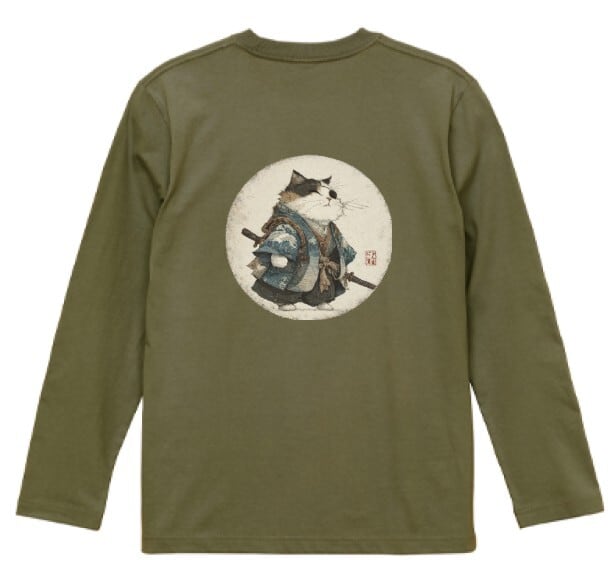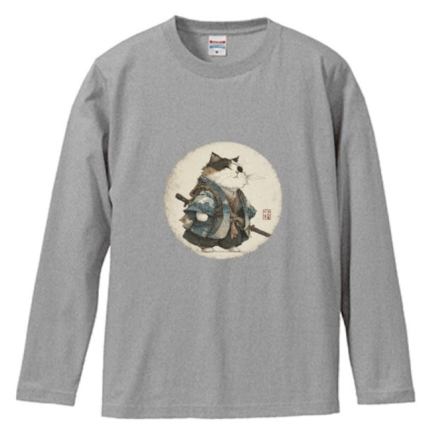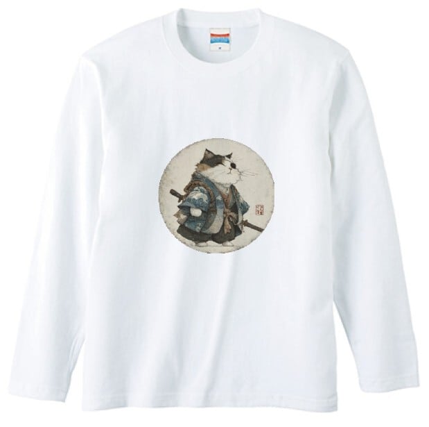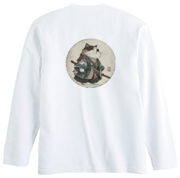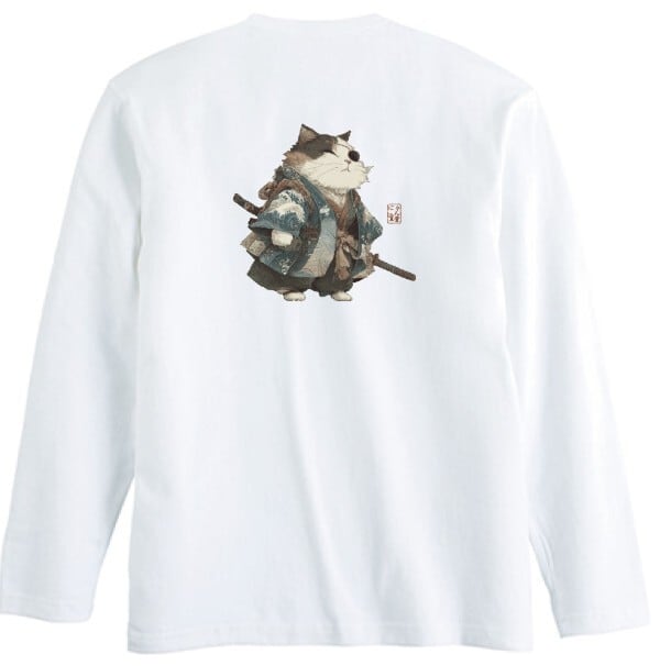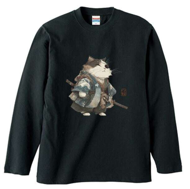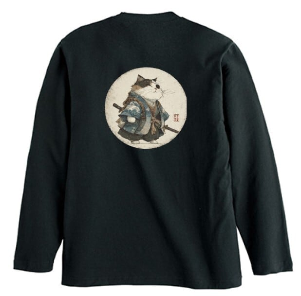 波斬り仁義の猫侍 長袖Tシャツ / Wave-Slashing Cat Samurai Japanese Art Apparel