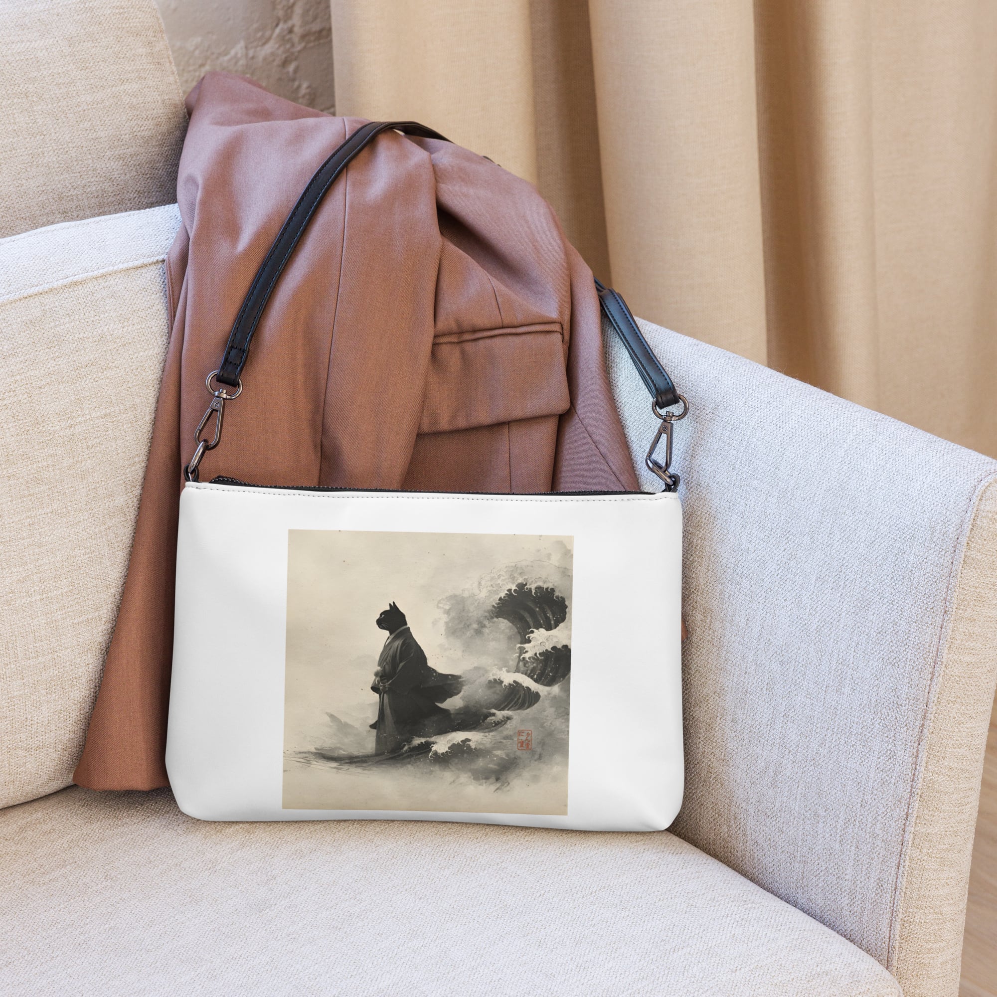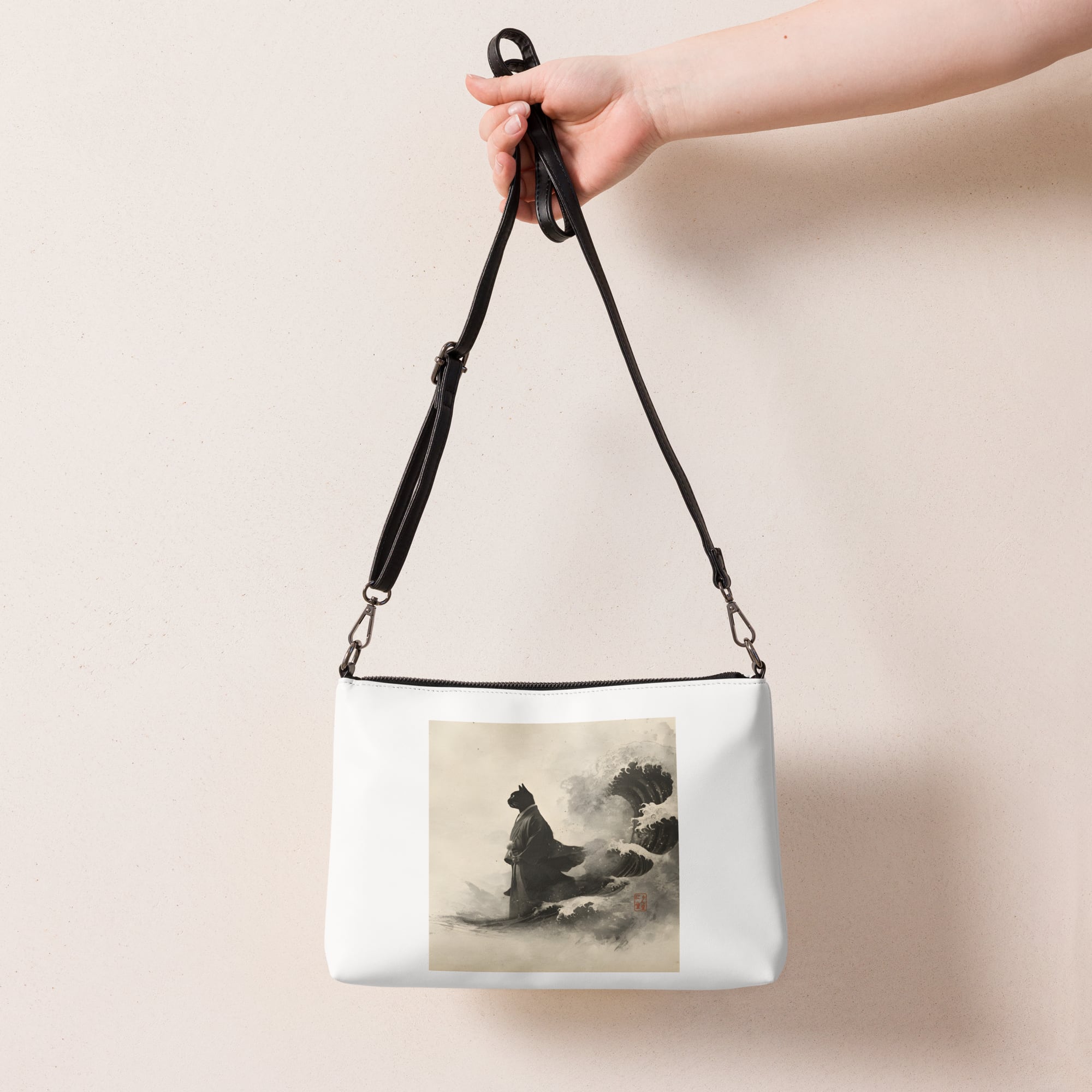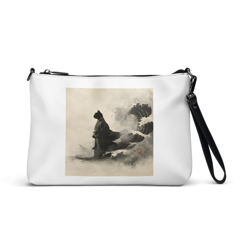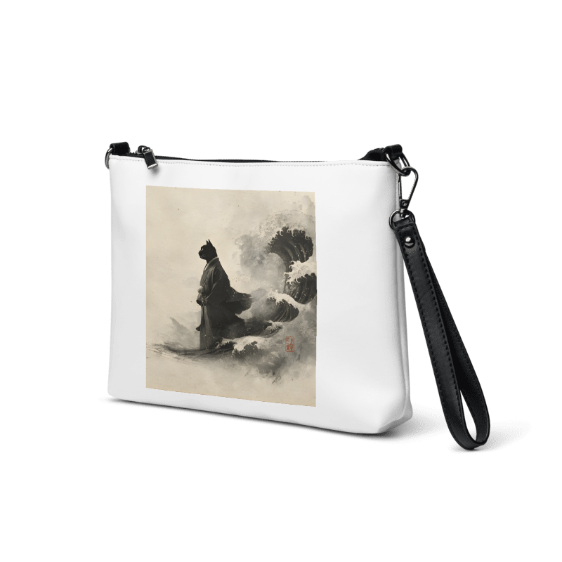 「荒波を越える、黒き江戸猫」クロスボディバッグ ショルダーバッグ/"A Black Edo Cat Crossing the Rough Seas" Crossbody Bag/Shoulder Bag