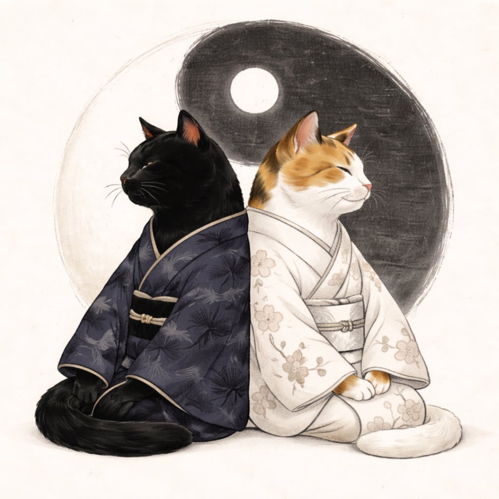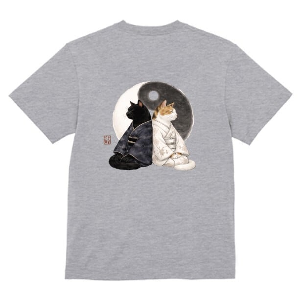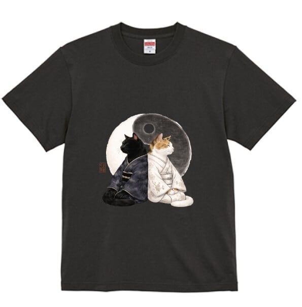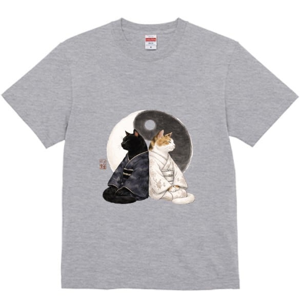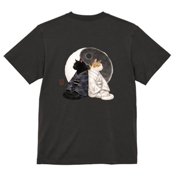 「陰陽に寄り添う、三毛の雅」 Tシャツ 半袖 /"Elegant Calico Cat Embracing Yin and Yang" T-shirt (Short Sleeve)