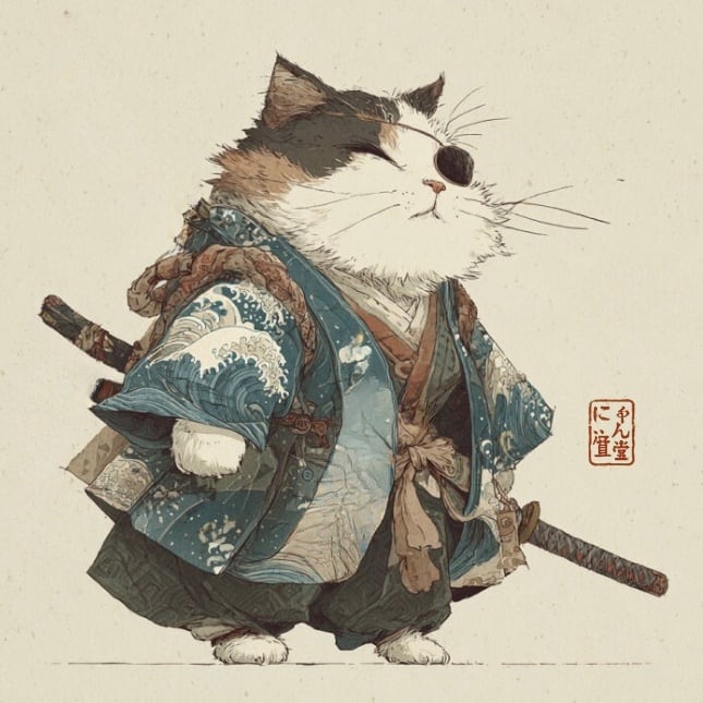 もふもふの毛並みと、歴戦の証である眼帯のギャップが魅力。羽織に描かれた波模様も力強く、一枚のアートとして完成されています。あえて背景の和紙ごとプリントすることで、「絵画作品そのもの」を纏うという、こだわりの仕様です。