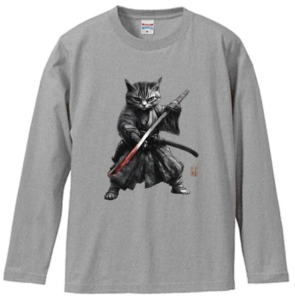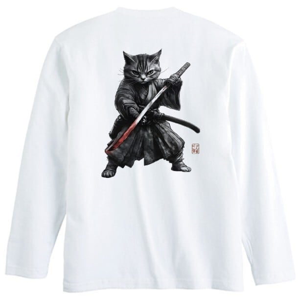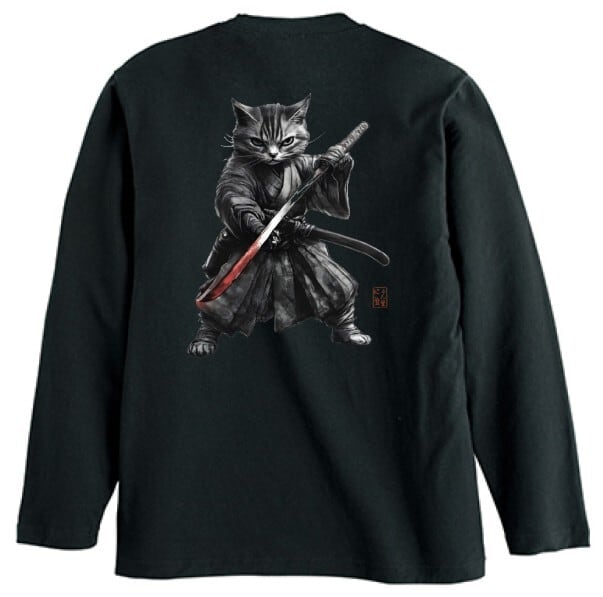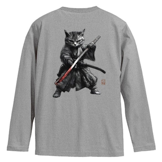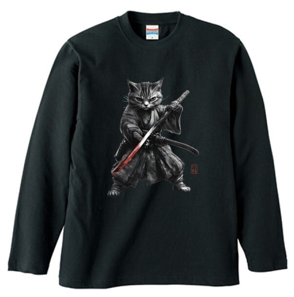 「闘志を纏う侍猫」長袖Tシャツ リブなし/"Fighting Spirit Samurai Cat" Japanese Art Apparel