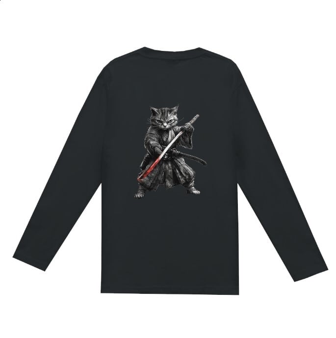 「闘志を纏う侍猫」長袖Tシャツ リブなし/"Fighting Spirit Samurai Cat" Long Sleeve T-Shirt (No Ribbing)