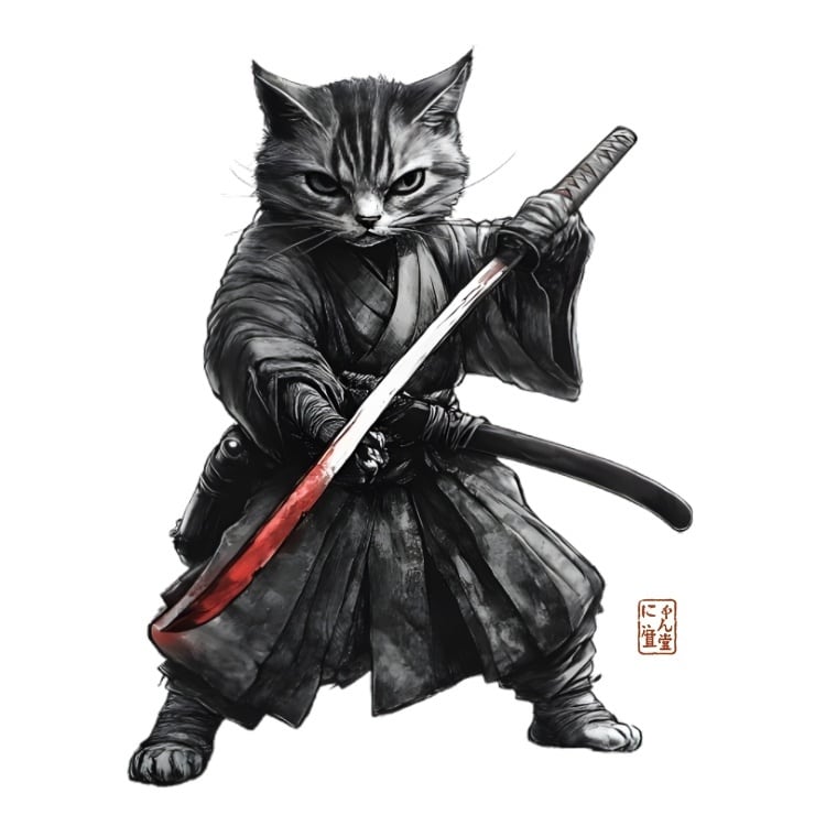 "The strength and beauty of this assassin cat are revealed by its sharp gaze and crimson-stained blade."This one-of-a-kind original print, imbued with the spirit of Japanese culture,will add a touch of individuality to your everyday life.This special design is available only at Nyanko Rekido.